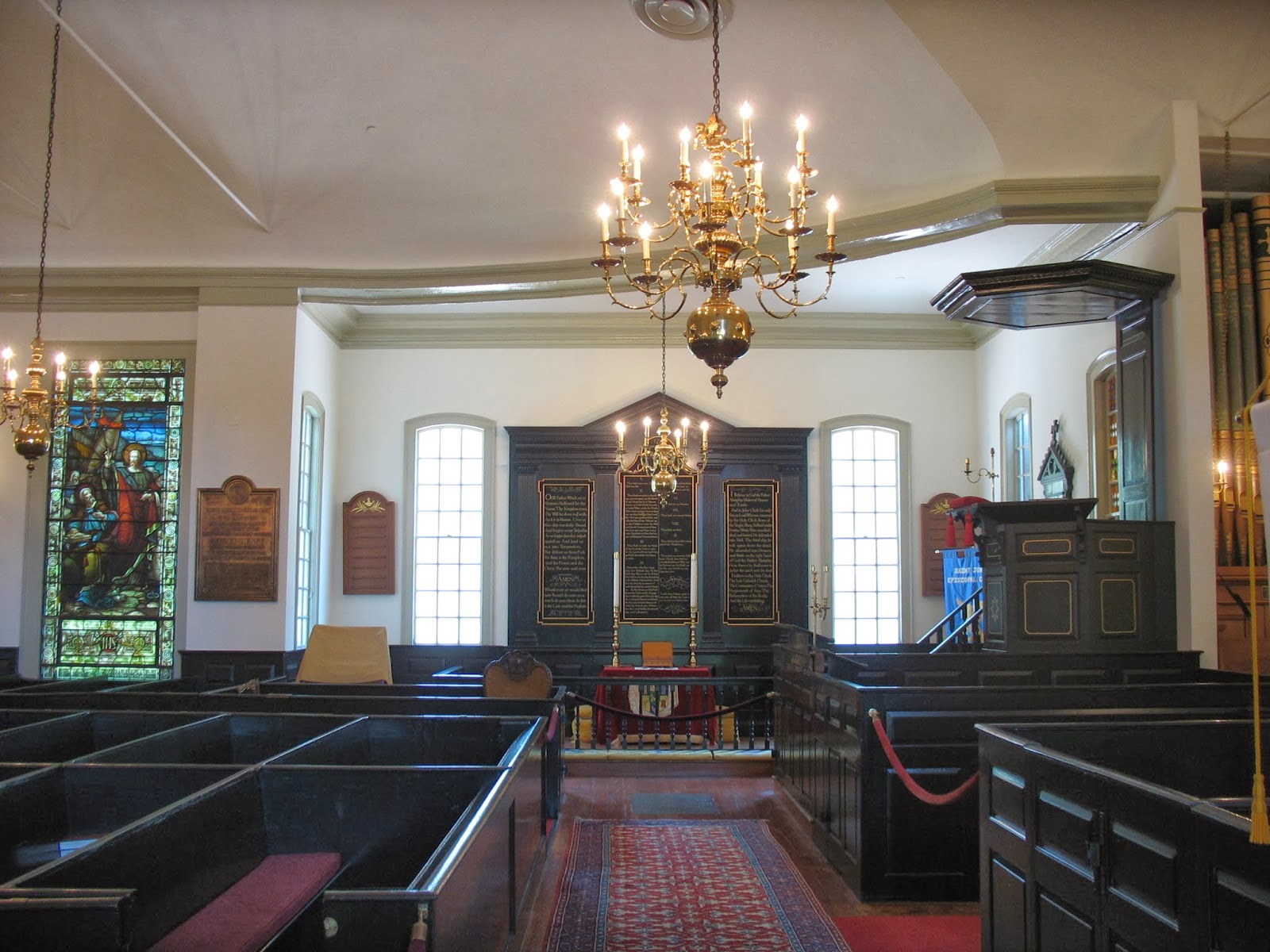 The layout of the interior indicates the multi-directional liturgical use of the building in keeping with then-current local and British usage. Different sections of the building were used for the various services called for in the official Book of Common Prayer. Music was associated with the gallery in many churches, while the baptismal font was near the west entry door, symbolizing the entry into the Christian life, and the triple-decker pulpit was probably placed along the north wall in the body of the church, where the sermon and prayers offered each Sunday could be readily seen and heard. The chancel, a special area set apart at the east end of the church by a rail, was the location of the holy table, principally used during the seasonal celebrations of Holy Communion. The people sat in high box pews, from which they could face in different directions.